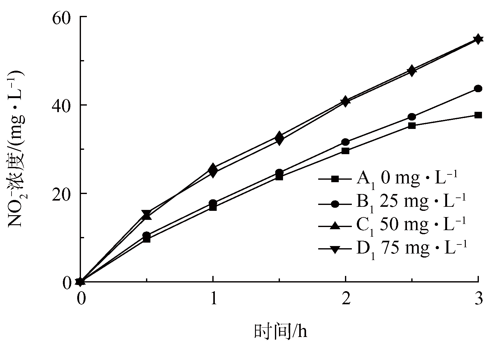反硝化批次實驗前期工作同短程硝化批次實驗,共進行3 h,反應器密封并連接氮氣保證厭氧環境,編號分別為批次反應器A2、B2、C2。向3個反應器中分別添加相同組分的合成廢水4 L,其中:NO2− 60 mg·L−1,無COD添加。利用Na2HPO4和NaH2PO4緩沖溶液,將反應器pH控制在8,反應器A2不添加硫化物,反應器B2、C2中加入不同濃度的硫化物,B2為25 mg·L−1,C2為50 mg·L−1。每1 h取樣檢測亞硝酸根、硫化物的濃度。