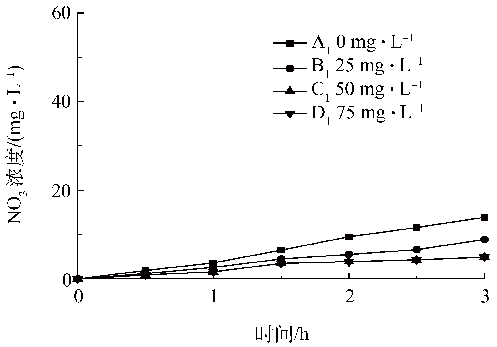 圖11 不同濃度硫化物條件下反應器A1、B1、C1、D1硝酸鹽濃度變化