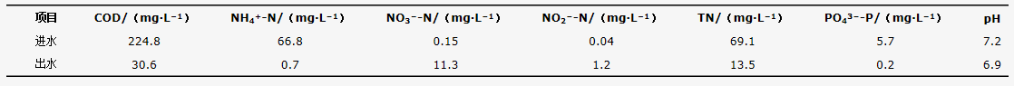 A2/O反應器有效容積28 L,均分為8個格室,水力停留時間8 h,厭氧、缺氧、好氧區容積比為1:6:1;厭氧區和缺氧區內設有攪拌裝置,好氧區進行短暫曝氣,污泥齡(SRT)控制在10 d左右。中間沉淀池為豎流式,采用中間進水周邊出水的運行方式,有效容積10 L,剩余污泥定期排放。MBBR 3格串聯,有效容積10.5 L,內設聚丙烯懸浮填料(尺寸D × H為5 mm × 3 mm,填充率50%),溶解氧3.0~4.0 mg·L−1,總曝氣量 0.15 m3·h−1左右,主要完成氨氮的氧化,最后出水直接排放。