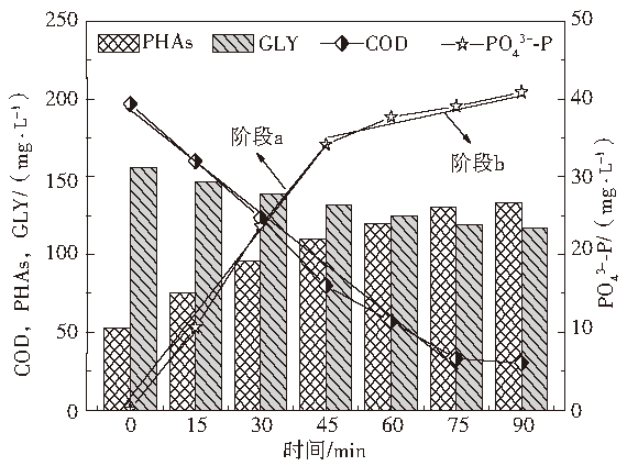 2)厭氧釋磷速率在45 min時出現明顯的分界,2個階段的釋磷速率分別為15.14 mg·(g·h)−1和3.0 mg·(g·h)−1,前者PHAs合成量是后者的2.49倍。