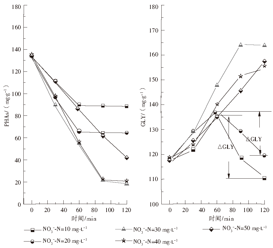 圖5 NO3−-N濃度對PHAs和GLY轉化利用特性的影響