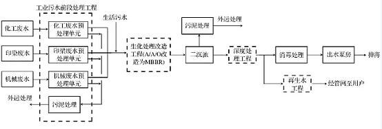 化工、印染、機(jī)械三類工業(yè)污水經(jīng)專業(yè)管網(wǎng)收集后進(jìn)入到污水處理廠分別進(jìn)行處理,處理后與生活污水統(tǒng)一匯集進(jìn)入到MBBR池進(jìn)行生化處理;經(jīng)二沉池沉淀后進(jìn)行深度處理達(dá)到《城鎮(zhèn)污水處理廠污染物排放標(biāo)準(zhǔn)》(GB18918-2002)一級(jí)A標(biāo)準(zhǔn),再經(jīng)消毒處理及提升后排海;為了增加污水再生利用率,一部分處理出水經(jīng)再生水工程處理后達(dá)到工業(yè)再生回用水的水質(zhì)標(biāo)準(zhǔn)。經(jīng)改造后小港污水處理廠工藝流程如圖2所示。