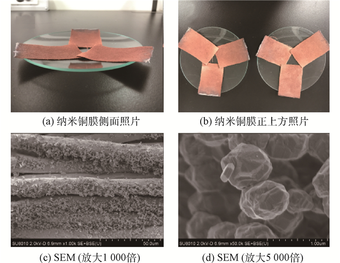 稱取3.125 0 g(Cu(CH3COO)2·H2O)(15.7 mmol)于燒杯中,并加入290 mL水,逐滴加入10 mL 85%的N2H4·H2O,將尺寸為4 cm×6 cm的棉布浸沒在溶液中,12 h后取出,分別用超純水和無水乙醇洗滌3次,60 ℃真空干燥2 h,得到樣品銅膜,銅膜上負載納米銅的質量約為0.304 2 g。