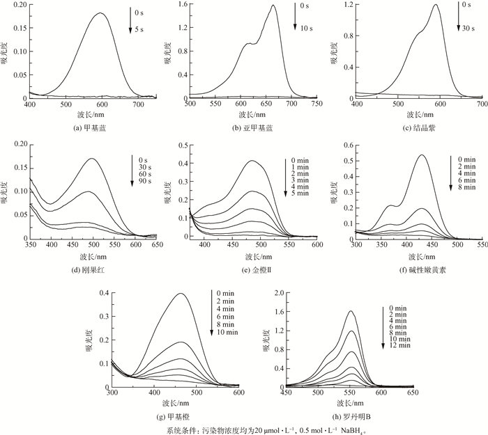 利用納米銅膜做催化劑,催化還原甲基藍、亞甲基藍、結晶紫、剛果紅、金橙Ⅱ、堿性嫩黃素、甲基橙和羅丹明B的過程和結果如圖 3所示,可以看出200 mL 20 μmol·L-1的甲基藍(圖 3(a))、亞甲基藍(圖 3(b))和結晶紫(圖 3(c))在各自最大吸收波長處的特征吸收峰隨反應時間的變化快速降低,分別只需5 s、10 s和30 s,可完全褪色;相同濃度的剛果紅(圖 3(d))和金橙Ⅱ(圖 3(e))也只需要1.5 min和5 min即可完全褪色;相對以上染料褪色速度較慢的堿性嫩黃素(圖 3(f))、甲基橙(圖 3(g))和羅丹明B(圖 3(h)),分別需要8、10和12 min即可完全褪色。