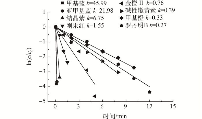 從圖 4中也可以看出各種染料脫色過程中的反應速率常數中甲基藍的最大,達到了45.99 min-1,其次是亞甲基藍,k值為21.98 min-1,然后依次是結晶紫、剛果紅、金橙Ⅱ、堿性嫩黃素、甲基橙和羅丹明B。