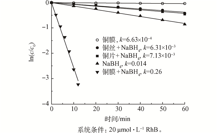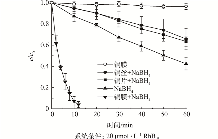 為了證明是銅膜在起作用,本研究以羅丹明B為例,設置不同體系下羅丹明B的脫色效果,如圖 5所示。在對比實驗中,當向20 μmol·L-1的羅丹明B反應液中只加NaBH4時,羅丹明B經過1 h的還原脫色程度只能達到58%;而當反應液中不加入NaBH4,只放入銅膜時,此時反應中沒有還原劑,體系內不發生還原反應,羅丹明B的濃度幾乎不發生變化;當相還原體系加入尺寸為4 cm×6 cm的銅片后,羅丹明B經過1 h的反應只能除去34%;加入潔凈的銅絲后的效果與加入銅片后的脫色效果相似,1 h后羅丹明B的脫色效率為37%;而使用銅膜的催化還原體系只需12 min就可以除去98%的羅丹明B,這說明在整個染料的脫色實驗中是本研究制備的銅膜在起作用,而且催化效率很高。