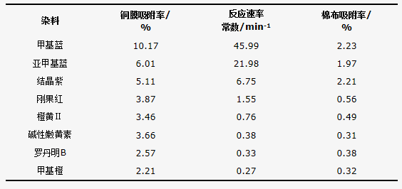 表1 8種染料脫色的反應速率常數和在納米銅膜及棉布表面吸附率