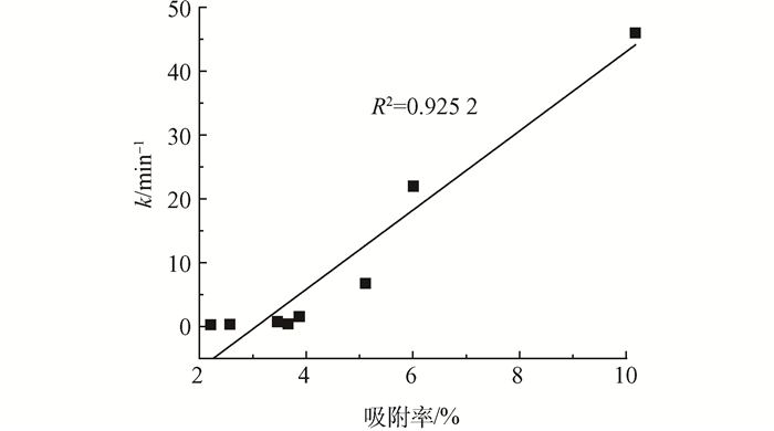 通過實驗現象可以發現甲基藍的脫色速度是最快的,造成這個現象的主要原因是納米銅膜對這幾種染料的吸附能力不同,由表 1可以看出棉布對每種染料均有吸附,但吸附效果較銅膜的吸附效果來說相對較弱,說明吸附作用主要來自于銅膜對染料的吸附作用。其中銅膜對甲基藍的吸附效果最佳,吸附率達到10.17%,也是由于甲基藍分子對銅膜表面的高吸附度顯著增強電子轉移效率和與活性氫的接觸機會,所以甲基藍的脫色速度是最快的。其次將銅膜吸附染料的吸附率結果與染料脫色過程的反應速率常數進行線性擬合,見圖 8,其線性關系明顯,R2=0.925 2,說明銅膜表面對染料的吸附情況決定了脫色反應的快慢。