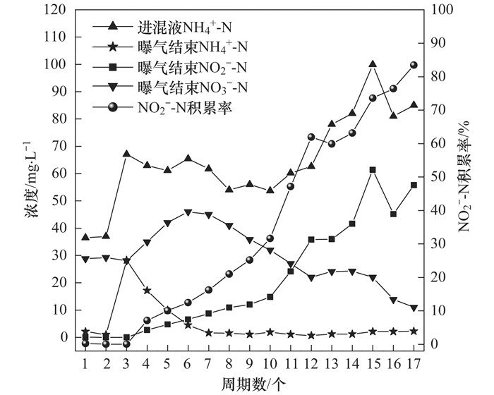 調整廢水的稀釋比, 將進混液的NH4+-N濃度增至54~67 mg·L-1(平均61 mg·L-1), 繼續運行了10個周期(3~12周期, 圖 1).在新的進水條件下, 硝化菌的活性受到了影響, 在前幾個周期, 曝氣結束時仍有剩余的NH4+-N未被氧化.隨著硝化菌對環境的逐漸適應, 經過3、4個周期運行后, 曝氣結束時混合液的NH4+-N濃度很快降低至2 mg·L-1以下并趨于穩定.從圖 1可見, 進水NH4+-N濃度增加后, 曝氣結束時NO2--N的積累率持續上升, 運行到馴化的第12周期時, 混合液NO2--N濃度達到36 mg·L-1, 積累率已接近62%.從第13周期開始, 進水改為不經稀釋的原水(進混液NH4+-N濃度為78~100 mg·L-1, 平均為85 mg·L-1), 圖 1中給出了5個周期(13~17周期)的試驗數據.可見, 提高NH4+-N濃度后的頭一個周期, 即馴化的第13周期, NO2--N的積累率略有降低(由62%降至60%), 這可能是AOB的活性受到了高NH4+-N的沖擊影響, 從第14周期開始NO2--N的積累率恢復呈快速上升狀態, 直到馴化的第17周期, NO2--N的積累率上升至83.4%, 并且此時NO2--N的積累率仍處在快速上升階段(圖 1).