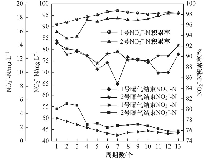 取自企業的生產廢水水質具有波動性, 本試驗階段進混液NH4+-N的平均濃度為91 mg·L-1(略高于上一階段), 13個周期的試驗結果見圖 2.從中可見, 降低污泥濃度后, 兩個反應器同樣都能夠獲得良好的硝化效果, 但pH的變化, 對NO2--N的積累率有一定影響.控制pH的1號系統, 曝氣結束時繼續延續了NO2--N積累率持續上升的趨勢, 并在第7周期積累率達到95%以上, 之后積累率在緩慢上升過程中漸近穩定, 曝氣結束時相應的NO3--N濃度也在緩慢下降過程中趨于2~3 mg·L-1.取消對pH限制的2號系統, 第1周期NO2--N的積累率由83.4%降至74.6%, 曝氣結束時NO3--N濃度超過17 mg·L-1, 在之后的6個周期中NO2--N積累率具有波動性, 從第7周期開始NO2--N的積累率恢復上升趨勢, 最后運行到第13周期, 積累率上升至94%, 曝氣結束時NO3--N濃度降至5.3 mg·L-1.可見, 在曝氣過程中取消對系統pH的限制, 對于已經啟動短程硝化的玉米淀粉廢水SBR處理系統, 維持較高的溫度和較低的DO, 并結合對硝化過程的在線控制, 同樣可獲得穩定的短程硝化效果.