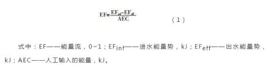 能量流分析是將進出污水處理系統(tǒng)的各種污染物按照能量的方式統(tǒng)一計量,將污水處理廠的運行效果從物質(zhì)角度的多指標評價轉(zhuǎn)化成從能量角度的單一指標評價。能量流的定義如式(1)所示。