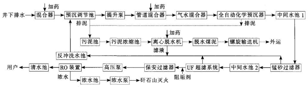 礦井廢水的水質特點:礦井水中的主要污染物為懸浮物(SS),構成這些SS的主要是煤屑、巖粉、粘土等細小顆粒物,尤其是煤粉,共含量為幾十到幾百毫克升。而且煤粉能被重各鉀等強氧化劑氧化,顯示較高濃度的COD,由于受到煤、度機油、乳化油等污染,礦井水中還含有一定量的油類。