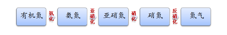 第二,利用微生物硝化和反硝化去除廢水中的氨氮,其原理是硝化菌和反硝化菌的聯合作用,將水中氨氮轉化為氮氣以達到脫氮目的。首先通過硝化細菌和亞硝化細菌將氨氮轉化為亞硝酸鹽和硝酸鹽,然后再進行反硝化,將硝酸鹽轉化為氮氣。其反應原理圖如下所示: