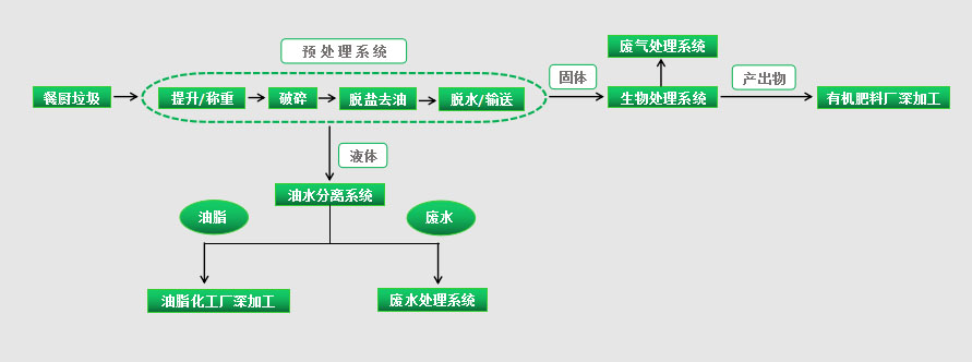 采用自動分選、自動破碎、油水渣三相分離工藝,自動化、封閉式處理,實現泔水無害化的處理工藝流程。
