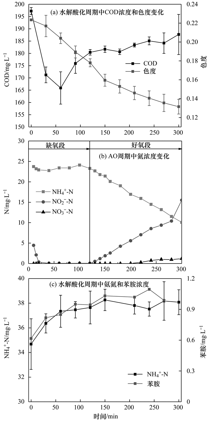 根據(jù)圖 1(b)中NO2--N和NO3--N濃度變化, AO反應(yīng)過(guò)程中在20 min內(nèi)完成反硝化; 硝化過(guò)程中, NO3--N濃度較低, 出現(xiàn)明顯的NO2--N積累, 亞硝化率為73.8%.由圖 1(c)可知, 苯胺濃度隨染料降解而增加, 因此染料及其代謝產(chǎn)物苯胺等可能對(duì)硝化菌活性有抑制作用, 導(dǎo)致NO2--N積累, 總氮的去除率僅為34.9%.根據(jù)Singh等的研究, 水解酸化脫色率為72.3%, 可以推測(cè)理論上苯胺的生成量為3.28 mg·L-1.在蟲(chóng)漆酶等酶的作用下, 偶氮染料不能完全降解為苯胺, 因此測(cè)出的苯胺濃度約為1 mg·L-1.晉玉亮等的研究發(fā)現(xiàn)在進(jìn)水苯胺濃度超過(guò)3 mg·L-1時(shí), 活性污泥的硝化能力喪失, 且苯胺對(duì)硝化的抑制是可恢復(fù)的; 當(dāng)苯胺濃度低于0.5 mg·L-1時(shí), NH4+-N去除率可以恢復(fù)至正常水平.