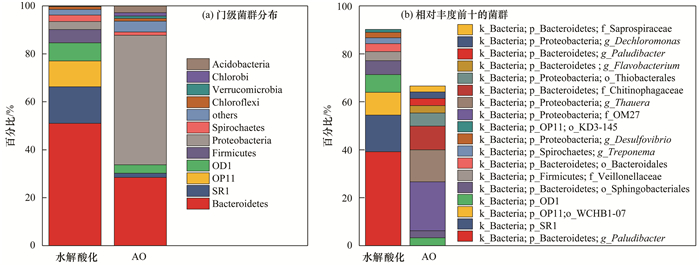 圖 2 水解酸化和AO反應(yīng)器中的菌群分布AO反應(yīng)器中主要的門(mén)級(jí)菌群為相對(duì)豐度為54.0%的Proteobacteria、28.4%的Bacteroidetes、以及在1%~3.5%之間的OD1、Acidobacteria、SR1、Spirochaetes、Chlorobi、Chloroflexi和Verrucomicrobia. AO反應(yīng)器中主要的硝化菌為Nitrospira, 相對(duì)豐度為0.28%, 是一種常見(jiàn)的硝化菌.本研究反硝化菌中相對(duì)豐度最高的為Rhodocyclaceae中Thauera, 相對(duì)豐度為13.35%. Thauera不僅是常見(jiàn)的反硝化菌, 還具有降解芳香胺類物質(zhì)的能力.在NO2--N積累條件下, Thauera可成為反硝化菌中優(yōu)勢(shì)菌種; 這與AO反應(yīng)器中出現(xiàn)NO2--N積累現(xiàn)象一致.由于AO進(jìn)水為水解酸化出水, 因此含有RR2代謝產(chǎn)物芳香胺等物質(zhì), 可被Thauera降解.同屬于Rhodocyclaceae的Dechloromonas相對(duì)豐度為2.73%, 也是一種高效的反硝化菌. AO反應(yīng)器中檢測(cè)到的相對(duì)豐度較高的OD1, 其堿基序列與Lactobacillus paracollinoides strain DSM 15502和Lactobacillus collinoides strain JCM1123有95%的相似度, 因此可能具有乳酸菌Lactobacillus發(fā)酵的功能, 可將碳源降解用于反硝化.