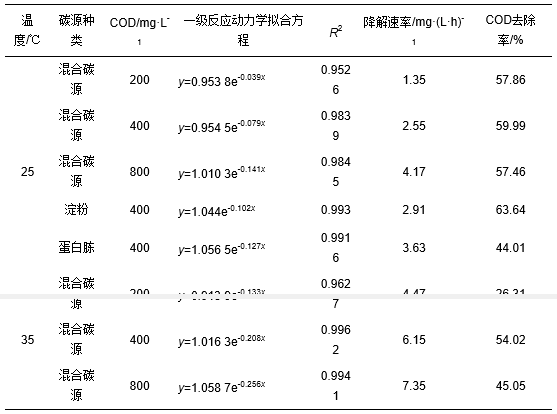 在COD=400 mg·L-1、25℃條件下, 以蛋白胨為碳源時(shí), RR2的降解速率最快, 為3.63 mg·(L·h)-1, 其次為淀粉2.91 mg·(L·h)-1, 而混合碳源條件下最慢, 僅為2.55 mg·(L·h)-1(圖 3).因此, 以蛋白胨和淀粉為單一碳源時(shí)染料RR2降解速率高于混合碳源. Rasool等研究了以乳酸、葡萄糖和乙醇為碳源時(shí)印染廢水處理效果, 結(jié)果表明與以葡萄糖為碳源相比, 以乳酸和葡萄糖作為碳源時(shí)色度去除率提高. Cirik等處理含有Cr的印染廢水時(shí)也發(fā)現(xiàn), 乙醇作為碳源時(shí)色度去除率比葡萄糖作為碳源時(shí)高.因此碳源種類影響偶氮染料降解的效果.