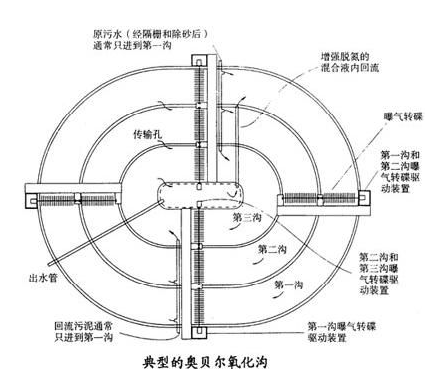 氧化溝一般由溝體、曝氣設備、進出水裝置、導流和混合設備組成,溝體的平面形狀一般呈環形,也可以是長方形、L形、圓形或其他形狀,溝端面形狀多為矩形和梯形。下圖是奧貝爾氧化溝的工藝圖: