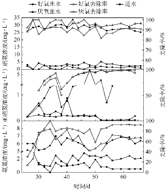 反應器掛膜培養成熟后穩定運行25~66 d,處理水質NO3−-N濃度為(29.54±1.97) mg·L−1,NH4+-N濃度(5.79±1.50) mg·L−1,pH=7.71±0.34,HRT=20 h,好氧反應器DO=3.0 mg·L−1,厭氧反應器DO<0.1 mg·L−1,水質變化見圖4。由圖4可知,好氧反應器的硝酸鹽氮平均去除率為91.24%,平均出水濃度為2.539 mg·L−1;厭氧反應器的硝酸鹽氮平均去除率為96.32%,平均出水濃度為1.036 mg·L−1。2個反應器都表現出較高的硝酸鹽氮去除效率。分析原因主要是自制微電解化學催化固體顆粒與天然生物質耦合生物載體,將化學催化還原與生物自養、異養反硝化進行耦合的結果,充分利用自制微電解化學催化固體顆粒的原電池反應還原硝酸鹽氮,同時為生物體系中自養反硝化菌提供所需的電子;利用天然生物質絲瓜絡為異養反硝化菌提供必要的生長繁殖所需的有限有機物,實現聯合高效脫氮。在整個反應體系中,細菌可以利用氫化酶加速催化固體顆粒的鐵腐蝕,同時鐵元素為微生物生長繁殖及酶輔基提供必要的微量元素,原電池反應過程中所產生的鐵離子可提高生物脫氫酶等酶系的活性]。原電池反應、自養脫氮、異養脫氮三者協同作用的脫氮效果明顯優于單一過程。此外厭氧反應器的pH(7.55~8.18)與好氧反應器的pH(8.25~8.57)都有利于硝酸鹽氮的還原,為反硝化細菌提供更多的電子供給。CHENG等研究發現增加緩釋碳源可以促進脫氮效率尤其是反硝化脫氮。