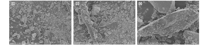 為了對PSFM復(fù)配混凝劑表面形貌和結(jié)構(gòu)的研究, 將其置于-60℃冷凍干燥器中冷凍干燥48 h并用研缽研磨, 得固體粉末狀PSFM復(fù)配混凝劑. 圖 2分別為PSFM復(fù)配混凝劑放大1×103倍、2×103倍和1×104倍后的掃描電鏡圖, 從圖 2(a)和2(b)可以看出, PSFM中有大量塊狀晶體存在, 同時大塊晶體周圍分布著無數(shù)細(xì)小顆粒.從圖 2(c)發(fā)現(xiàn), 該混凝劑主體部分呈現(xiàn)長鏈狀, 周圍還分布類似于枝杈短鏈, 該結(jié)構(gòu)能有效增強(qiáng)PSFM復(fù)配混凝劑的橋聯(lián)聚合和網(wǎng)捕卷掃作用.這是因?yàn)楣杷崦撍s合形成長長的主鏈, 向聚硅酸中引入鐵、錳金屬離子后, 鐵、錳金屬離子及它們的聚合離子被吸附、螯合或發(fā)生Si—O—Fe(Mn)配位鍵等作用, 使其結(jié)構(gòu)發(fā)生如此變化.該長鏈周圍還有部分小顆粒狀物質(zhì)存在, 這部分顆粒狀物質(zhì)可能是鐵錳復(fù)合物團(tuán)聚所致.