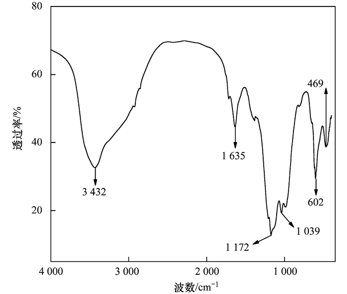 圖 3為PSFM的紅外光譜(FTIR)圖, 469 cm-1處是FeOOH的吸收峰[20], 602 cm-1處是Si—OH—Fe、Si—OH—Mn的彎曲振動, 1 039 cm-1為Si—O—Fe、Si—O—Mn的彎曲振動峰[21], 1 172 cm-1為Fe—O、Mn—O的伸縮振動[22], 1 635 cm-1是氫氧化鐵中羥基的彎曲振動峰[23, 24], 3 432 cm-1附近是由絮凝劑中的—OH以及吸附的水分子和配位水分子產(chǎn)生的—OH伸縮振動產(chǎn)生的吸收峰[25].以上分析表明Fe離子和Mn離子與Si通過—O—或—OH形成高聚化合物, 其將聚硅和鐵、錳金屬離子及其水解聚合物的優(yōu)勢結(jié)合在一起, 同時具有聚硅的橋聯(lián)聚合性能和羥鐵、錳基多核配合物的吸附性能.進(jìn)一步說明在反應(yīng)中鐵、錳與硅酸發(fā)生了絡(luò)合反應(yīng)生成新的共聚物, 而不是原料的簡單吸附混合.此外, 由于Fe、Mn離子的橋聯(lián)能力比Si離子較弱, 故它位于鏈末端時對橋聯(lián)速度有一定的抑制作用, 增強(qiáng)混凝劑的穩(wěn)定性[26].