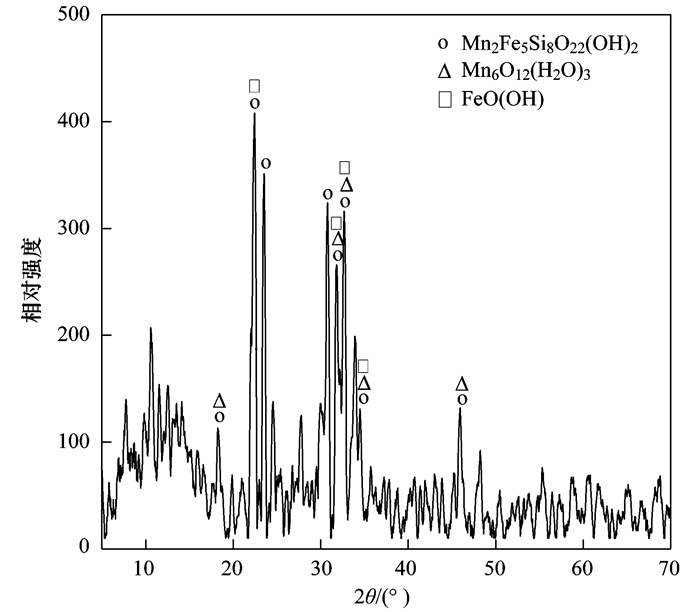 圖 4是聚硅酸鐵錳復(fù)配混凝劑的XRD圖.與PDF標(biāo)準(zhǔn)卡片對比可知聚硅酸鐵錳復(fù)配混凝劑中物相主要有聚硅酸鐵錳、水合二氧化錳和羥基氧化鐵等聚合物, 說明PSFM制備過程中, 并不只是鐵、錳和硅酸的一個聚合反應(yīng), 還包括水合二氧化錳和羥基氧化鐵等具有吸附助凝作用的聚合物生成, 對混凝過程起到了強(qiáng)化混凝效果, 這與紅外分析結(jié)果相一致.