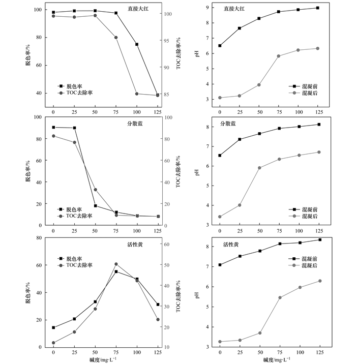 高堿性條件下, 混凝劑的水解產(chǎn)物一般為大分子高聚體產(chǎn)物[27], 對直接大紅、分散藍(lán)和活性黃染料分子的橋聯(lián)吸附和網(wǎng)捕卷掃作用可能為混凝過程的主要機(jī)制, 溶液中的OH-和染料分子間存在競爭吸附關(guān)系, 削弱正電荷的礬花膠體對染料的吸附能力, 導(dǎo)致染料的去除效果降低.混凝前后溶液pH值隨堿度變化如圖 6, 由于HCO3-的水解(產(chǎn)生OH-)程度大于電離(產(chǎn)生H+)程度, 其水溶液呈弱堿性.隨堿度增大, 溶液pH值都逐漸增大, 但兩者并不呈線性關(guān)系, 堿度在0~75 mg·L-1之間時, 3種溶液pH值均在6~8.5左右, 由于混凝劑顯酸性, 發(fā)生酸堿中和反應(yīng), 故混凝后溶液pH值有所降低.在堿度分別為50、0和75 mg·L-1時, 直接大紅、分散藍(lán)和活性黃染料溶液的pH值分別在8.5、6.5和8.2左右, 此時混凝劑分別發(fā)揮最佳的橋聯(lián)聚合和靜電吸附協(xié)同作用, 染料廢水凈化效率分別達(dá)到最高.