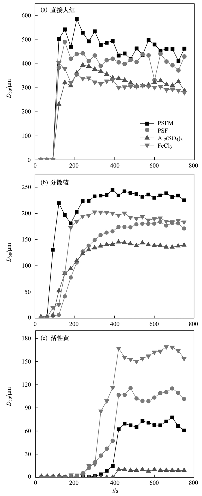 由圖 9可以看出, 對于直接大紅和分散藍(lán)的處理, PSFM混凝劑平衡時所形成的絮體粒徑遠(yuǎn)大于其它3種混凝劑. PSFM、PSF、Al2(SO4)3和FeCl3這4種混凝劑分別處理直接大紅和分散藍(lán)時, 形成的絮體平衡時粒徑分別可達(dá)620、420、400、230 μm和240、200、180、145 μm.分析原因在于以靜電吸附為主要作用機(jī)制的傳統(tǒng)混凝劑難以克服溶解性差、表面帶有大量負(fù)電荷的大顆粒直接染料和分散染料, 而PSFM除了傳統(tǒng)的混凝機(jī)制外, 鐵錳復(fù)合物的吸附助凝協(xié)同作用使得染料分子進(jìn)一步接觸絮凝形成更大粒徑的絮狀物, 快速形成肉眼可見的絮體.以溶解性較好的活性黃為目標(biāo)污染物時, PSFM混凝所形成的絮體平衡粒徑為80 μm, 而FeCl3混凝所形成的絮體平衡粒徑為160 μm.對于活性黃的處理, PSFM中的Fe+水解產(chǎn)生的帶正電的多核配合物、鐵錳復(fù)合物的吸附助凝和聚硅的橋聯(lián)吸附協(xié)同作用不足以克服活性黃染料分子之間的靜電斥力, 反而單獨(dú)的FeCl3水解產(chǎn)生的帶正電的多核配合物的靜電吸附作用更易使小分子活性黃染料凝聚成大顆粒.