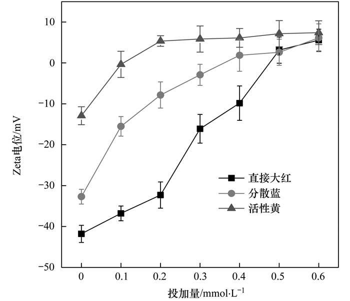圖 8分別為直接大紅、分散藍(lán)和活性黃這3種染料廢水在不同PSFM投加量下的Zeta電位, 每個Zeta電位點(diǎn)都重復(fù)實(shí)驗(yàn)3次, 最后取平均值.直接大紅、分散藍(lán)和活性黃原始溶液Zeta電位分別為-41.8、-32.7和-12.9 mV.隨著PSFM投加量的增大, 直接大紅、分散藍(lán)和活性黃溶液Zeta電位均不斷上升, 而活性黃溶液在PSFM投加量為0.2 mmol·L-1時, 其Zeta電位幾乎達(dá)到最高值.可能是因?yàn)殡S著投量的增大, PSFM的靜電吸附能力得到了更充分地發(fā)揮. PSFM投加量分別為0.45、0.35和0.1 mmol·L-1時, 直接大紅、分散藍(lán)和活性黃溶液Zeta電位接近0 mV, 此時靜電吸附能力最強(qiáng).由圖 5可知, 在PSFM投加量分別為0.2、0.3和0.1 mmol·L-1時, 直接大紅、分散藍(lán)和活性黃溶液的凈化效率最高, 而此時的靜電吸附作用并不是最強(qiáng), 這就表明僅僅依靠電中和機(jī)制是無法完全解釋PSFM混凝作用過程的. PSFM在合適的投加量下通過對染料的靜電吸附、橋聯(lián)聚合和鐵錳復(fù)合物的吸附助凝等綜合作用得到最佳的混凝效果.