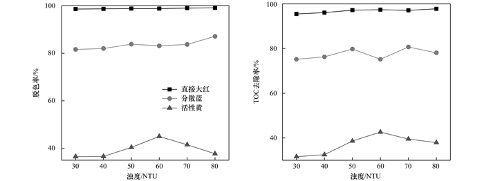 以高嶺土懸濁液模擬染料廢水濁度, 向染料溶液中加入一定的高嶺土懸濁液, 得不同濁度染料廢水, 考察濁度對PSFM混凝凈化不同染料廢水的效果, 結(jié)果如圖 7.不同濁度條件下, 直接大紅、分散藍(lán)和活性黃脫色率和TOC去除率相差不大.活性黃染料去除率先隨濁度增加而略有上升趨勢, 在濁度達(dá)到60 NTU后又略有下降趨勢, 總體而言, 活性黃染料廢水凈化效率受濁度影響較小.從圖 7明顯看出, PSFM對直接大紅、分散藍(lán)和活性黃的凈化效率依次為直接大紅>分散藍(lán)>活性黃, 與2.2節(jié)的實(shí)驗(yàn)結(jié)果保持一致.
