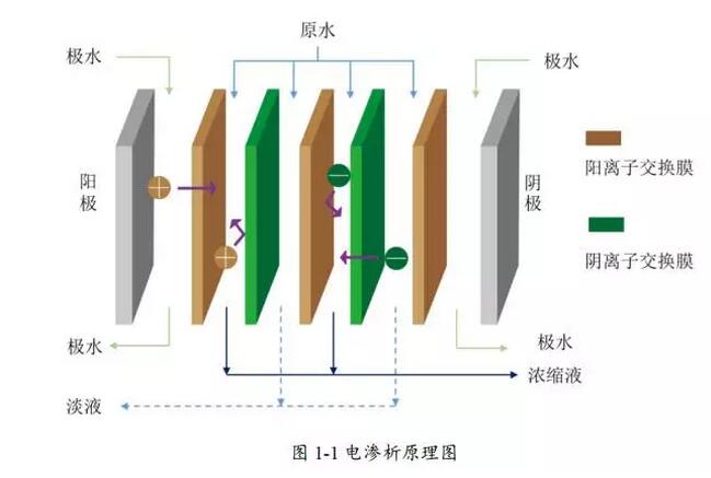 電滲析裝置通常由離子交換膜、電極和夾緊裝置三部分組成。電滲析過程的實質是電解質離子在兩股液流間的傳遞,其中一股液流失去電解質,成為淡化液,另一股液流得到電解質,成為濃縮液。因此,電滲析過程脫鹽溶液中的離子以兩個基本條件為依據: