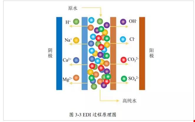 填充床電滲析又稱電脫離子法,是將離子交換膜與離子交換樹脂有機地結合在一起,在直流電場的作用下實現除去水中已電離的或可電離的物質的一種新型水處理技術。它利用電滲析過程中極化現象對離子交換填充床進行電化學再生,它巧妙地集中了電滲析連續脫鹽與離子交換樹脂深度脫鹽這兩種方法的優點,并且克服了它們的缺點,即電滲析過程的濃差極化現象和離子交換的化學再生過程。一般水中含鹽量為(50-15000mg/L)時都可使用,而對含鹽量低的水更為適宜。這種方法基本能夠除去水中全部離子,所以它在制備高純水及處理放射性廢水方面有著廣泛的用途。EDI過程原理如圖3-3所示。
