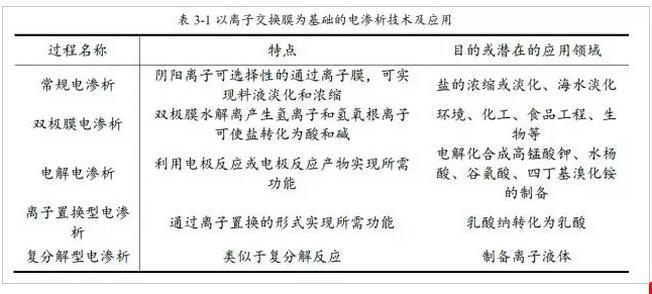 以離子交換膜為基礎的電滲析技術及應用如表3-1所示。