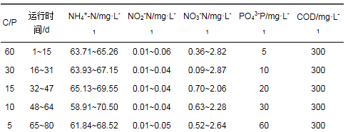 本文用水取自青島市某污水處理廠粗格柵預處理后城市污水, 試驗過程中通過投加固態無水乙酸鈉為碳源調節其進水COD濃度為300mg·L-1, 同時以磷酸氫二鉀配置PO43--P母液, 用以調配不同濃度的C/P.試驗過程中不同C/P條件下反應器進水水質情況見表 1.