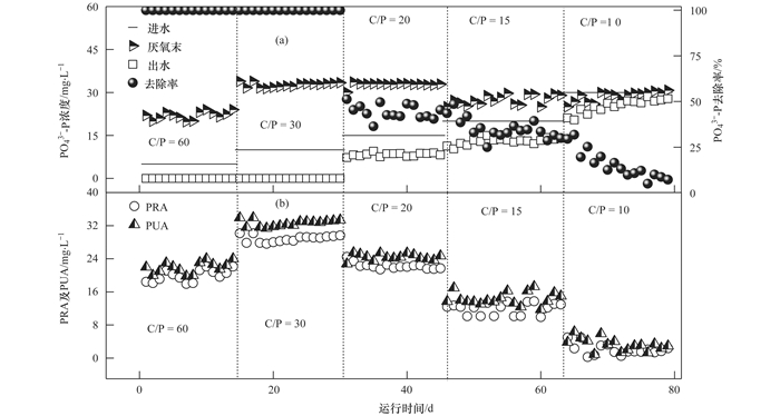 當進水C/P為20和15時(PO43--P濃度分別為15mg·L-1和20mg·L-1), PRA和PUA分別降低至21.4mg·L-1和12.8mg·L-1, 出水PO43--P濃度高達14.3mg·L-1, PO43--P去除率由51.3%降低至38.1%, 此時, 隨著進水PO43--P濃度的提高, 系統的除磷性能開始下降.可能是由于高磷負荷下PAOs的厭氧儲存PHA性能受抑制引起的[25], 因而其PRA和PUA均有所降低.