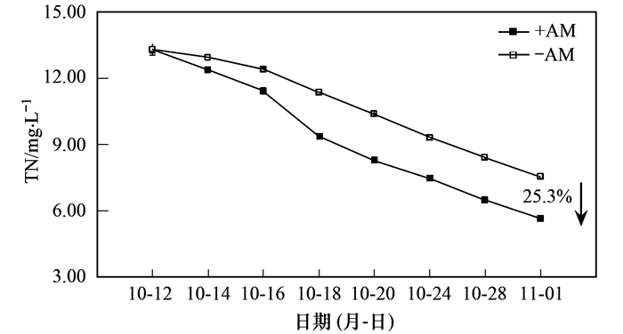 從圖 4可以看出, 接種AM真菌后生態浮床的脫氮能力明顯高于普通生態浮床. 21 d時普通生態浮床對TN的去除率為43.4%, AM強化型生態浮床對TN的去除率為57.6%, 去除率提高了32.7%.