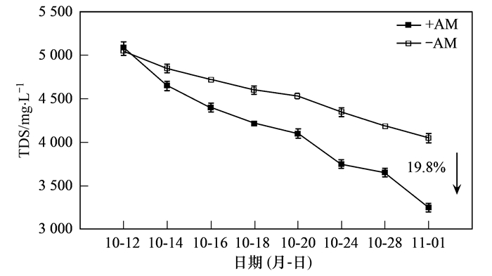 (2) AM提高了生態浮床處理含鹽廢水的能力, 對TDS、COD、TN和TP的去除率比普通生態浮床提高20%~35%.