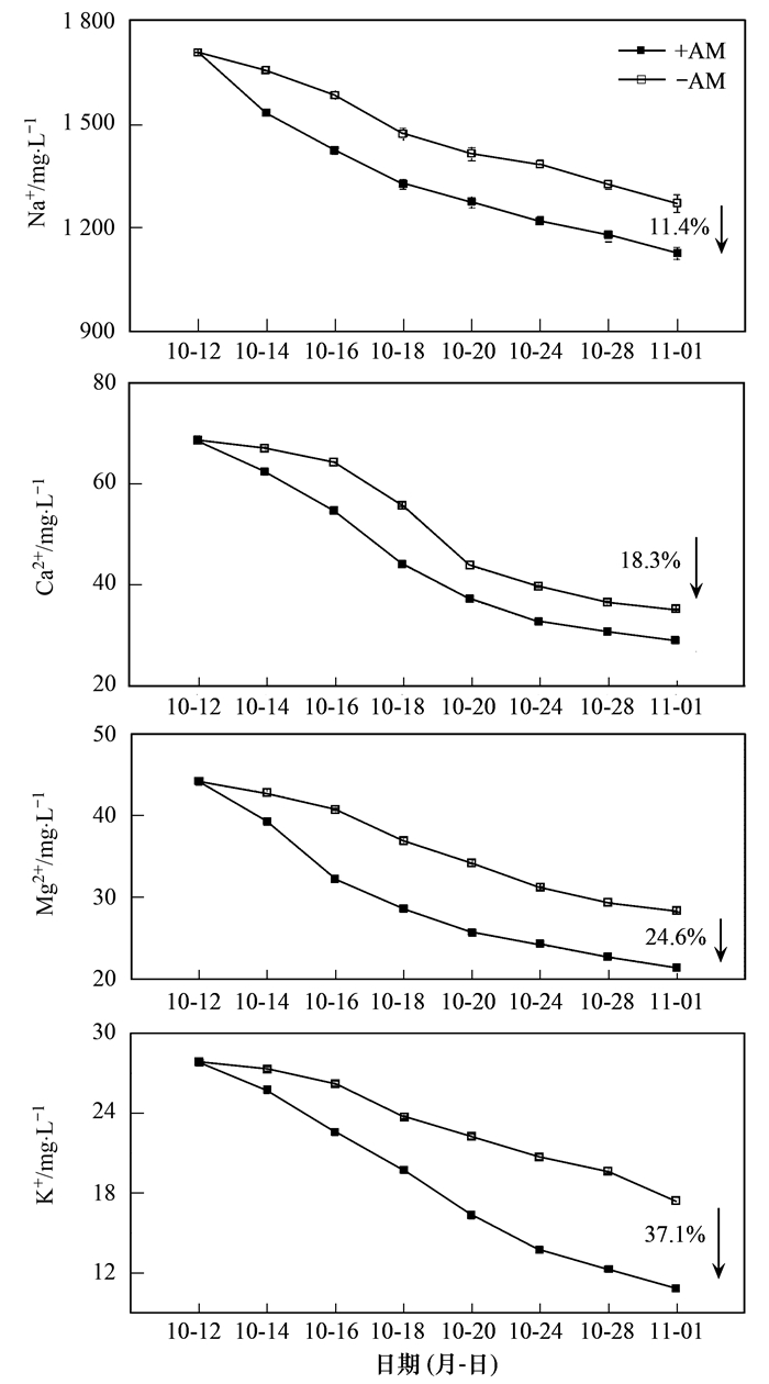 對含鹽廢水的除鹽處理來說, 首要目標是降低水體中鹽離子濃度.前期的分析結果顯示, 廢水中主要陽性鹽離子為Na、Ca、Mg和K.從圖 6可以看出, AM強化型生態浮床對Na、Ca、Mg和K這4種離子的去除率明顯高于普通生態浮床, 提高幅度在10%~40%之間, 其中對K離子去除效果促進作用更為明顯, 對Na離子促進作用最小.這可能與AM促進植物吸收K+、Ca2+, 增強植物抗耐Na+脅迫有關.