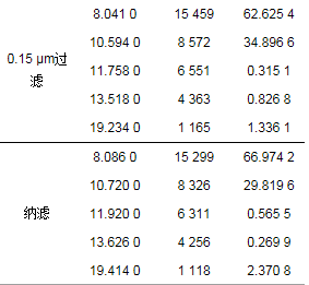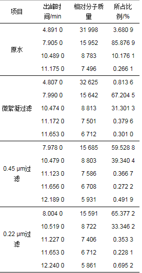 本實(shí)驗(yàn)采用高效液相色譜法對(duì)原水及各級(jí)處理出水中溶解性有機(jī)物的相對(duì)分子質(zhì)量進(jìn)行測(cè)定, 通過(guò)相應(yīng)地線性換算, 其相對(duì)分子質(zhì)量分布情況如表 3.原水中溶解性有機(jī)物相對(duì)分子質(zhì)量分布范圍廣, 但主要集中在4個(gè)水平:大于30 000、15 000左右、8 500左右和小于7 500, 其占比分別為3.680 9%、85.876 9%、10.176 1%和0.266 1%.經(jīng)微絮凝處理后, DOC下降21%, 其中相對(duì)分子質(zhì)量大于30 000的溶解性有機(jī)物占比從3.680 9%下降至0.813 6%, 相對(duì)分子質(zhì)量在1 500左右的溶解性有機(jī)物占比從85.876 9%下降至67.204 5%, 說(shuō)明微絮凝對(duì)相對(duì)分子質(zhì)量大于15 000的大分子溶解性有機(jī)物有一定的去除效果.經(jīng)0.45 μm和0.22 μm的醋酸纖維膜抽濾后的出水, 其色譜圖幾乎相同.說(shuō)明兩者對(duì)溶解性有機(jī)物的去除特性相近, 這就是為何許多學(xué)者在研究溶解性有機(jī)物時(shí)會(huì)選擇0.45 μm和0.22 μm的微濾膜作前處理.經(jīng)0.45 μm的醋酸纖維膜抽濾后, DOC去除率在6.7%, 相對(duì)分子質(zhì)量大于30 000的溶解性有機(jī)物已全部去除.0.15 μm的醋酸纖維膜和納濾對(duì)溶解性有機(jī)物的去除效果顯著, DOC去除率分別為14.3%和41.7%.但所有相對(duì)分子質(zhì)量的占比變化卻不明顯, 說(shuō)明0.15 μm的微濾膜和納濾對(duì)溶解性有機(jī)物的去除特性與有機(jī)物相對(duì)分子質(zhì)量分布的相關(guān)性較小.具體聯(lián)系污水寶或參見(jiàn)http://www.xhxdt.com更多相關(guān)技術(shù)文檔。