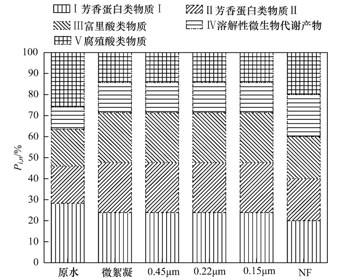 原水中芳香蛋白類物質(zhì)Ⅰ的占比為30.21%, 芳香蛋白類物質(zhì)Ⅱ的占比為18.89%, 富里酸類物質(zhì)的占比為18.89%, 溶解性微生物代謝產(chǎn)物的占比為11.33%, 腐殖酸類物質(zhì)占比為20.68%.經(jīng)微絮凝過(guò)濾后, 其出水中五類溶解性有機(jī)物的占比依次變?yōu)?4.28%、14.28%、23.81%、23.01%、24.62%, DOC濃度也從115mg ·L-1降低至95mg ·L-1.從DOC及各項(xiàng)占比變化來(lái)看, 微絮凝過(guò)濾主要對(duì)城市污水溶解性有機(jī)物中的芳香蛋白類物質(zhì)有很好的富集效果, 經(jīng)計(jì)算微絮凝過(guò)濾對(duì)芳香蛋白類物質(zhì)Ⅰ的富集程度為60.93%, 對(duì)芳香蛋白類物質(zhì)Ⅱ的富集程度為37.52%.經(jīng)0.15 μm微濾膜過(guò)濾后的出水中各項(xiàng)占比情況與微絮凝過(guò)濾一致, 依次分別為14.28%、14.28%、23.81%、23.01%、24.62%, 而納濾后的出水中各項(xiàng)占比均變?yōu)?0.00%, DOC濃度從70mg ·L-1降低至40mg ·L-1.從DOC及各項(xiàng)占比變化來(lái)看, 納濾主要對(duì)城市污水溶解性有機(jī)物中的富里酸類物質(zhì)和腐殖酸類物質(zhì)有很好的富集效果, 經(jīng)計(jì)算納濾對(duì)富里酸類物質(zhì)的富集程度為52.01%, 對(duì)腐殖酸類物質(zhì)的富集程度為53.57%.此外, 經(jīng)0.45 μm和0.22 μm的微濾膜過(guò)濾后, 城市污水中溶解性有機(jī)物的各項(xiàng)占比一致, 且所測(cè)DOC含量相同, 故可認(rèn)為兩者對(duì)有機(jī)物的去除效果相似.這也解釋了為何許多研究中為避免非溶解性有機(jī)物和無(wú)機(jī)顆粒對(duì)實(shí)驗(yàn)的影響, 選擇0.45 μm或0.22 μm的微濾膜作前處理, 以更準(zhǔn)確地分析水樣中的溶解性有機(jī)物.