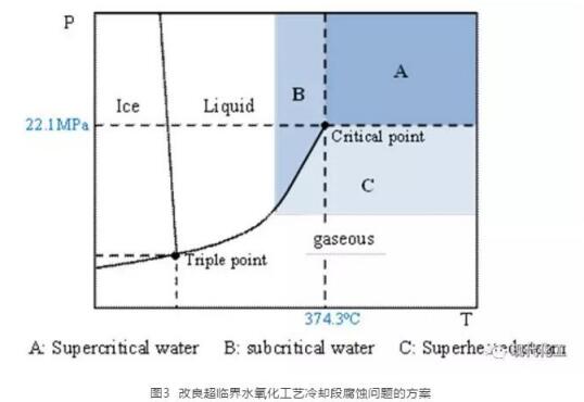 另一種減少低溫段腐蝕的方案如圖3所示。此方案的亮點(diǎn)在于盡量縮短反應(yīng)器與液相接觸的時(shí)間。傳統(tǒng)SCWO工藝?yán)鋮s過程為A區(qū)至B區(qū),先降溫后降壓,處理后的廢水由超臨界狀態(tài)降溫至亞臨界狀態(tài),反應(yīng)器一直處于腐蝕性較強(qiáng)的亞臨界水浸泡狀態(tài)。新方案類似閃蒸工藝,廢水由A區(qū)至C區(qū),先降壓再降溫,處理后的廢水由超臨界狀態(tài)降壓至過熱水蒸氣狀態(tài),同時(shí)此過程伴隨著急速降溫。過熱水蒸氣的腐蝕性遠(yuǎn)遠(yuǎn)低于亞臨界水,可有效緩解廢水對(duì)反應(yīng)器的腐蝕。此外,冷卻段結(jié)構(gòu)的低壓力負(fù)荷,可選用如玻璃鋼的簡(jiǎn)易結(jié)構(gòu)設(shè)計(jì)與材質(zhì)選擇。