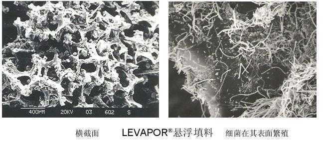通過使用 LEVAPOR懸浮填料能對工業污水的各類污染物質非常有效地去除。LEVAPOR懸浮填料是有彈性和孔隙的高分子物質,由具有表面活性的顏料例如活性碳加以改性,從而使吸附面積最大能達到 20000m2/m3, 該懸浮填料具有以下特性: