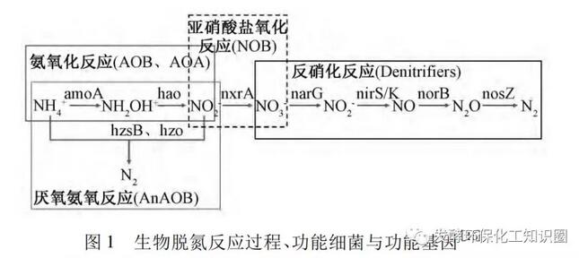 生物脫氮過程的主要功能微生物包括氨氧化細菌( Ammonia oxidizing bacteria,AOB) 、氨氧化古菌( Ammonia-oxidizing archaea,AOA) 、亞硝酸鹽氧化菌( Nitrite oxidizing bacteria,NOB) 、AnAOB和反硝化細菌( Denitrifier) 等,其轉化機制如圖1所示。