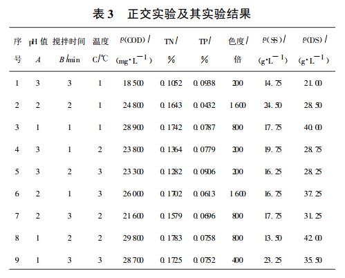 按上述數據處理方法對COD、TN、TP、色度、SS和DS六個指標分別進行直觀與方差分析得到的最優條件依次為:A3B3C1;A3B3C1;A2B2C1;A3B3C2;A3B1C2;A3B3C1,具體分析如下:
