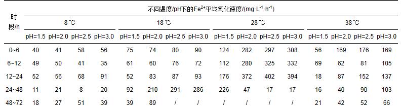 當溫度只有8 ℃時, 所有處理中Fe2+的氧化速度都很慢, 反應72 h時, Fe2+最高氧化率只有34.02%, 不同處理之間差異較小, 說明相對于pH而言, 溫度對A.ferrooxidans的影響作用更明顯.另外, 表 1中也沒有觀察到Fe2+加速氧化的現象, 不同時段Fe2+平均氧化速度基本在40~90 mg·L-1·h-1之間, 說明8 ℃下不利于A.ferrooxidans的生長繁殖.