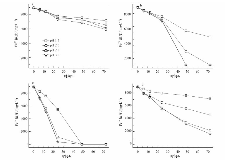 結合圖 1c和表 1可以看出, 28 ℃時A.ferrooxidans氧化Fe2+的速度最快, 這與Daoud 等(2006)的研究結果是接近的.當培養溫度為28 ℃時, 起始pH=2.0~3.0處理中的反應最快, Fe2+的最高平均氧化速度高達402 mg·L-1·h-1(pH=2.5, 12~24 h), 反應至24 h時90%以上的Fe2+被氧化;當pH降到1.5時, Fe2+的氧化速度明顯下降, Fe2+的最高平均氧化速度為226 mg·L-1·h-1(24~48 h), 反應至24 h時Fe2+氧化率只有39.35%.不過, 所有處理的Fe2+都在48 h內被完全氧化.由于A.ferrooxidans在氧化Fe2+的過程中可以獲得自身生命活動所需的能量, 因而在9K培養基中培養時, A.ferrooxidans會不斷繁殖, 菌密度會不斷增加.而因受低pH的影響, A.ferrooxidans活性或繁殖受到抑制, 表現出較低的Fe2+氧化速度.因此, 在圖 1c中可以看到, 在pH 2.0~3.0時, 12~24 h時段Fe2+的平均氧化速度要高于0~12 h時Fe2+的平均氧化速度, 而pH=1.5處理則表現出Fe2+最高氧化速度的延后性.