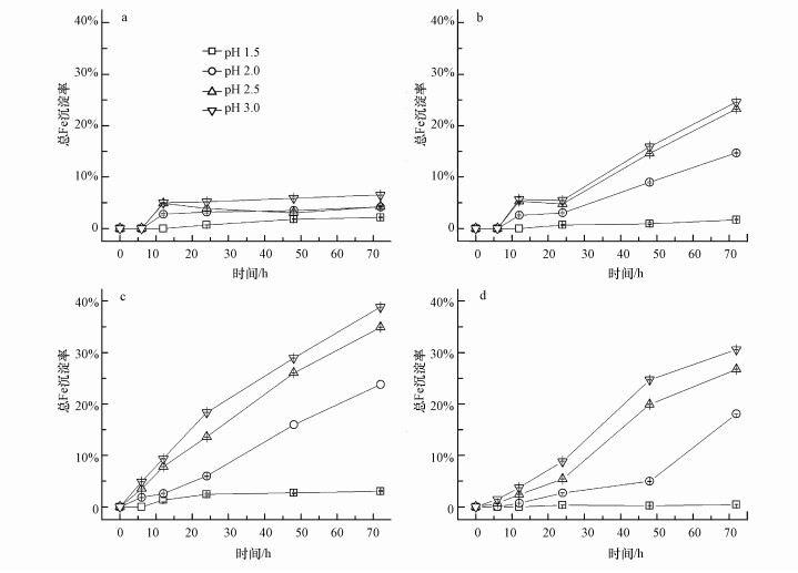 當反應溫度為8 ℃時(圖 2a), 通過觀察發現, 只有pH=3.0處理中出現渾濁, 有少量沉淀生成, 計算總Fe沉淀率為6.50%;而其它處理中則液體澄清, 瓶壁干凈, 沒有明顯的固相生成.究其原因有兩個:一是低溫不利于細菌氧化Fe2+(圖 1a和表 1), 從而導致體系中的Fe3+濃度低, 繼而不利于次生礦物的形成;另外一個就是次生礦物的形成是一個吸熱反應, 所以溫度低不利于Fe3+水解反應的進行.當溫度提高到18 ℃時(圖 2b), 除了起始pH=1.5處理外, 其它反應體系中均有沉淀生成, 且反應24 h后總Fe沉淀率呈直線上升趨勢, 結合表 1可以推測, Fe2+氧化速度的加快(24~48 h)促進體系Fe3+濃度的提高有利于次生礦物的生成.總體來說, 起始pH越高, 越有利于除去溶液中的可溶性鐵.當溫度提高到28 ℃時(圖 2c), 除pH=1.5處理外, 所有處理中總Fe沉淀率從反應啟動時就開始直線上升, 生成大量次生鐵礦物, 反應72 h后, pH=2.0、2.5、3.0時總Fe沉淀率分別達到23.75%、34.92%、38.85%.當溫度為38 ℃時(圖 2d), 較高pH處理也能保證一定的總Fe沉淀率.通過與18 ℃條件下的結果相比較發現, 雖然溫度升高不利于A.ferrooxidans對Fe2+充分氧化, 但卻能夠顯著促進次生鐵礦物的生成.說明高溫促進了Fe3+的水解, 吸熱效應促使次生鐵礦物的形成反應平衡向右移動.