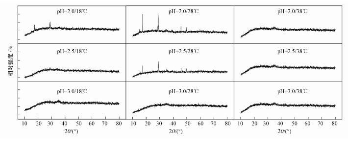 圖 3為改良9K培養基中培養72 h時收集得到的次生鐵礦物XRD譜.顯然, 溫度和起始pH對體系次生鐵礦物的種類都有一定的影響.在18 ℃環境下, 起始pH=2.5和pH=3.0處理收集的次生鐵礦物應為同一物質, 根據其衍射峰位置及相對強度, 分析礦物為一種無定型的施威特曼石.而起始pH=2.0時, 次生礦物開始出現微弱的黃鐵礬衍射峰.柏雙友等研究結果表明, Fe3+供應速度的提高是促進次生礦物相向黃鐵礬轉變的主要原因, 在相同條件下, 80 mmol·L-1 Fe2+時產物為純凈的施氏礦物, 而80 mmol·L-1 Fe2++10 mmol·L-1 Fe3+時主要產物為黃鐵礬.而結合圖 1可以發現, pH=2.0時Fe2+氧化速度不及pH=2.5~3.0, 這也間接說明促使黃鐵礬生成的因素不僅僅局限于Fe2+氧化速度, 與體系pH也密切相關.當溫度上升至28 ℃時, 起始pH=3.0時收集到的礦物為單一施威特曼石, 而在pH=2.0~2.5范圍內, pH降低有利于黃鐵礬的生成, 且pH越低, 表征的衍射峰越強, 這與Liao等研究結果一致.此外發現, 不同pH處理在38 ℃時獲得礦物相均為無定型的施威特曼石, 結合圖 1可以判斷, 較低的Fe3+供應速度是導致此溫度下次生礦物相為施威特曼石的主要原因.Kupka等研究表明, 在5 ℃環境下培養17 d后生成的礦物以施威特曼石為主, 并含有少量的黃鉀鐵礬, 而在30 ℃時則相反.因本研究培養時間只有3 d, 故在低溫時并未收集到任何礦物相的次生產物, 但從溫度18~28 ℃、pH=2.0~2.5時的培養結果來看, 與上述學者結論并不矛盾.Wang等報道, 溫度的升高有利于施威特曼石向黃鉀鐵礬轉變, 這在圖 3中也有所體現, 但前提是溫度不能過于極端, 且要保證培養體系起始pH在一定范圍內.